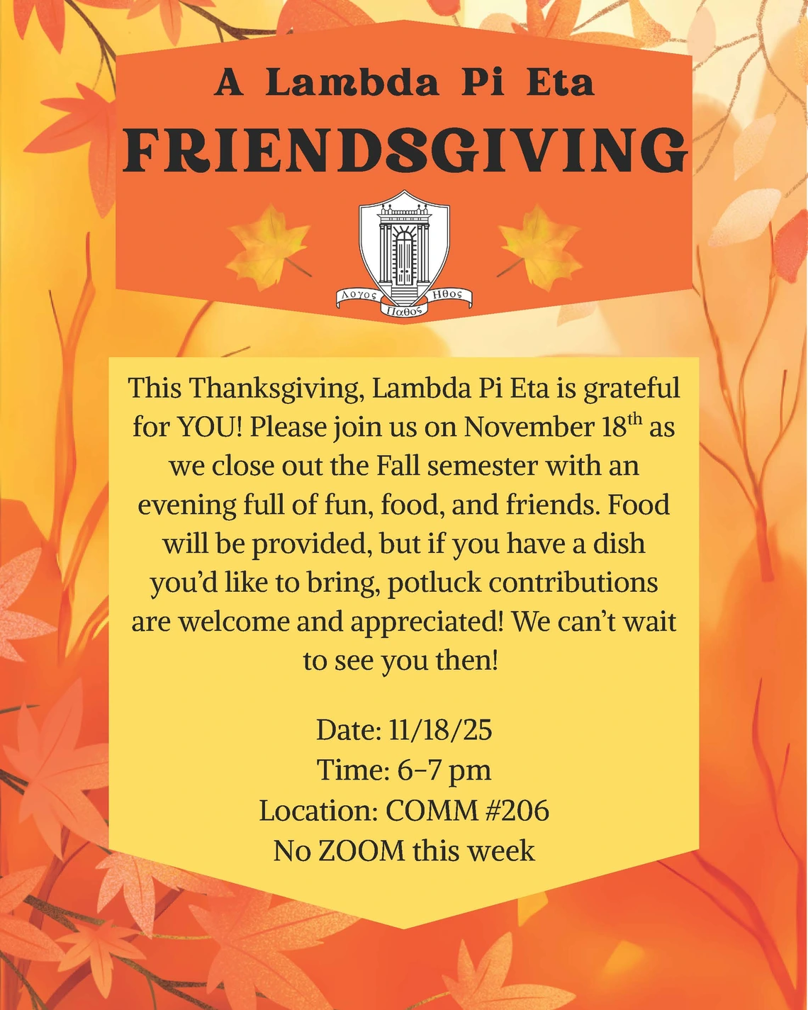 This Thanksgiving, Lambda Pi Eta is grateful for YOU! Please join us on November 18th, as we close out the Fall semester with an evening full of fun, food, and friends. Food will be provided, but if you have a dish you’d like to bring, potluck contributions are welcome and appreciated! We can’t wait to see you then!